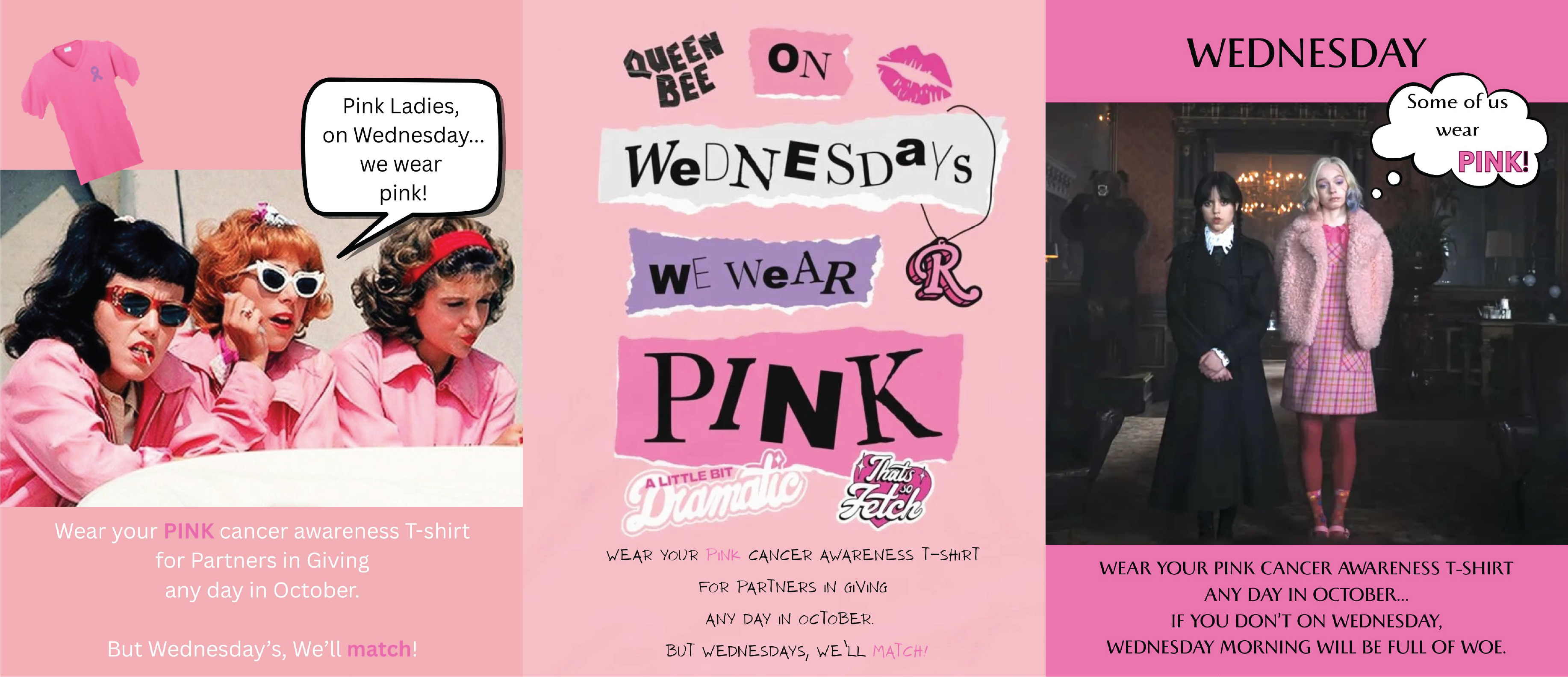 Sport your Pink Cancer Awareness Shirt any day in October, but on Wednesdays, we’ll match! Didn’t order a shirt this time… wear your best pink anyway (with name tags)!
